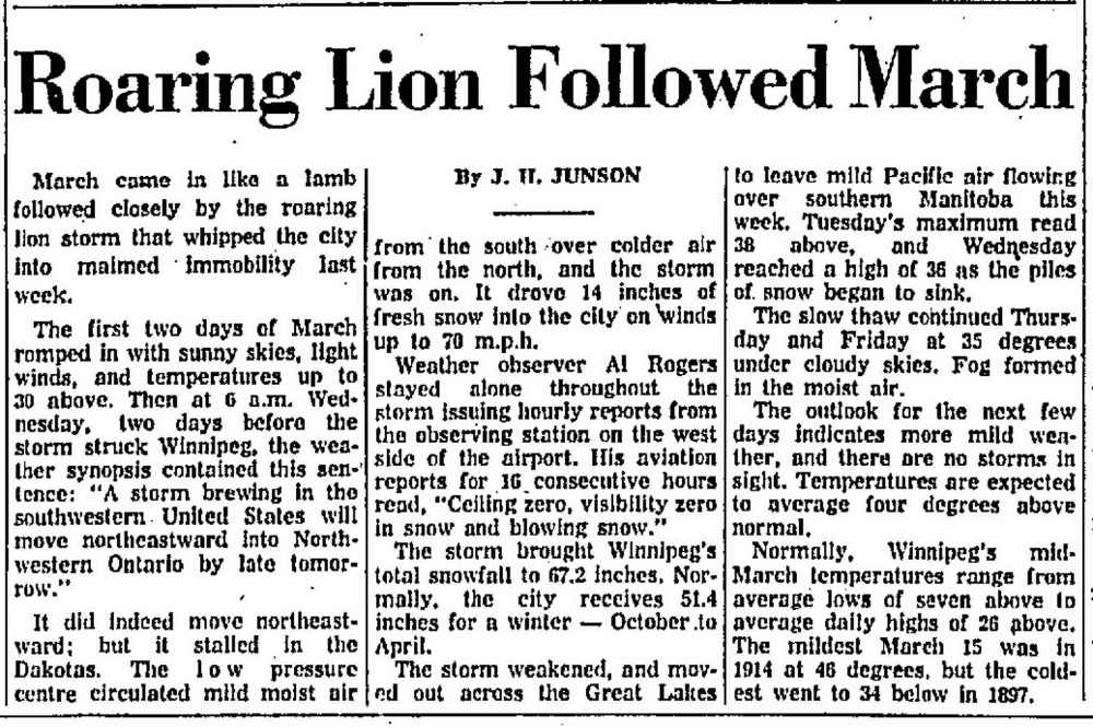 Free Press readers will recall from 1962 until about 1980, the elder Junson wrote a Saturday weather column. In his column six days after the blizzard, he poetically noted: “March came in like a lamb followed closely by the roaring lion storm that whipped the city into maimed immobility last week.”