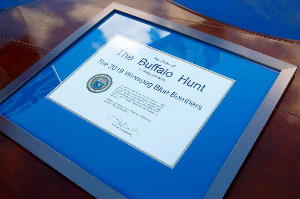 The 2019 Grey Cup champion Blue Bombers were invested into the Order of the Buffalo Hunt, which is one of Manitoba’s highest honours and given to those who display leadership and service.