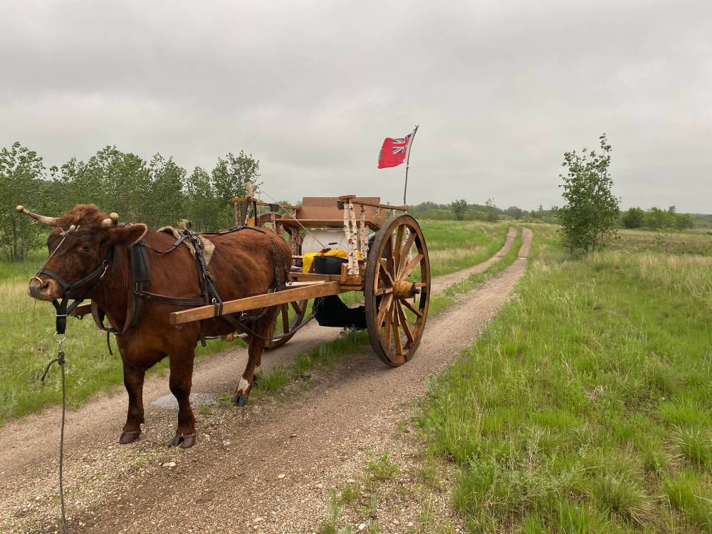 Agassiz Trailers are made in Winkler on the bottom of their eponymous lake. The company’s claim to quality states that their “trailer designs are built to withstand the drastic and sometimes extreme Canadian climates.” Sounds like a worthy successor to the original Manitoba-designed trailer. The kind being pulled by our ox. The Red River cart had some high-tech features, such as a tapered axle and matching hub core that would allow the cart to move in ‘drastically’ wet weather. If the axle ends had been straight, any swelling with moisture would cause the wheels to seize and then nothing would be able to turn them.