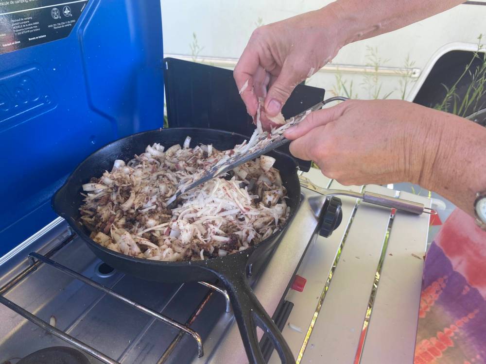 Today Patty decided to make a Red River specialty for supper. Richeau: pemmican stir-fry. Surprisingly delicious! Pemmican — a mixture of dried, pulverized buffalo meat and rendered buffalo fat — was the perfect food for the trail. It was high in energy, didn’t spoil and didn’t need any preparation (unless you wanted to go gourmet and make rubaboo or richeau). Pemmican also has the reputation for tasting kinda disgusting. Which tells you how impressive it is that Tim at Timothy’s Country Butcher Shop actually made the stuff taste good. And then he loaded us up with a journey’s supply of it!