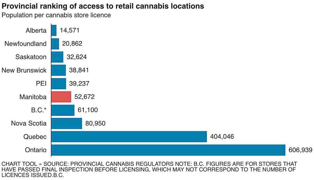 On a per capita basis, Manitobans have better access to retail weed than British Columbians, Quebecers and Ontarians, but worse access than consumers in Alberta, Newfoundland and Saskatchewan.