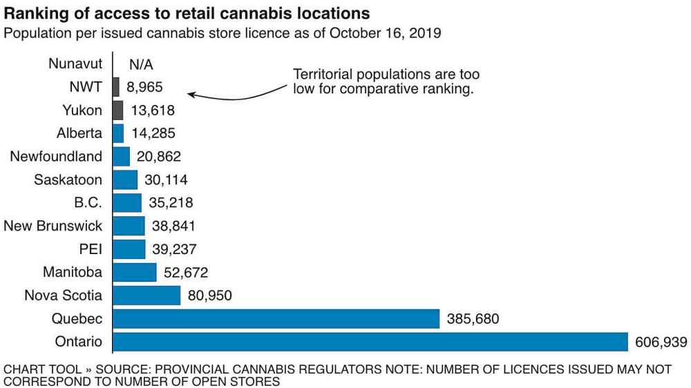 Canada’s two most populous provinces sit at the bottom of the licence-to-population rankings: Quebec has just 22 licensed stores serving nearly 8.5 million people, followed by Ontario, which, after a year, has only issued 24 licences to serve nearly 14.6 million Ontarians.