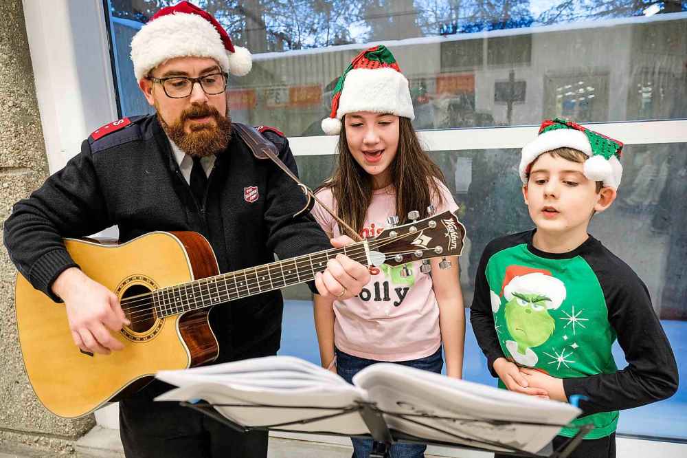 Captain Josh Howard (left) sings Christmas carols with his kids Abigail (middle) and Julian (right) at the Superstore on Portage Ave. to help the Salvation Army reach its goal of $385,000 by Christmas Day. (Daniel Crump / Winnipeg Free Press)