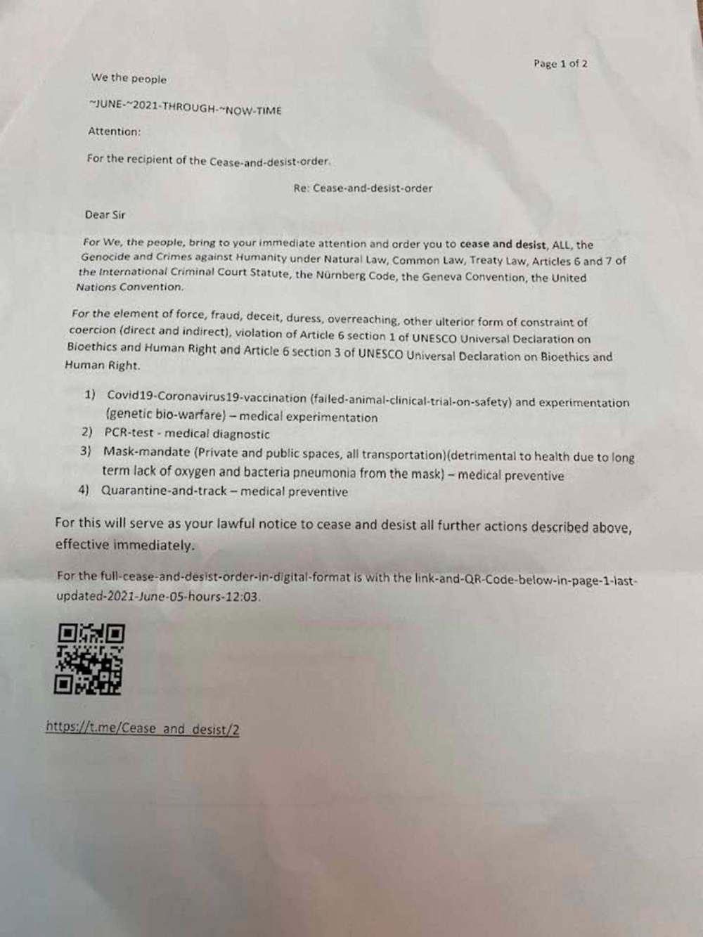 The unsigned letter, which comes from a so-called group “We the people,” tells recipients to stop “all the genocide and crimes against humanity” for promoting vaccinations, PCR tests, mask mandates and quarantines.