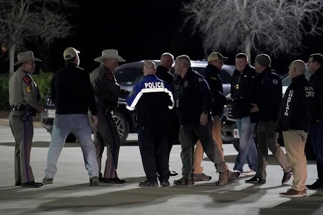 Law enforcement officials talk to each other after a news conference where they announced that all hostages at Congregation Beth Israel synagogue were safe and the hostage taker was dead on Saturday, Jan. 15, 2022, in Colleyville, Texas. (AP Photo/Tony Gutierrez)