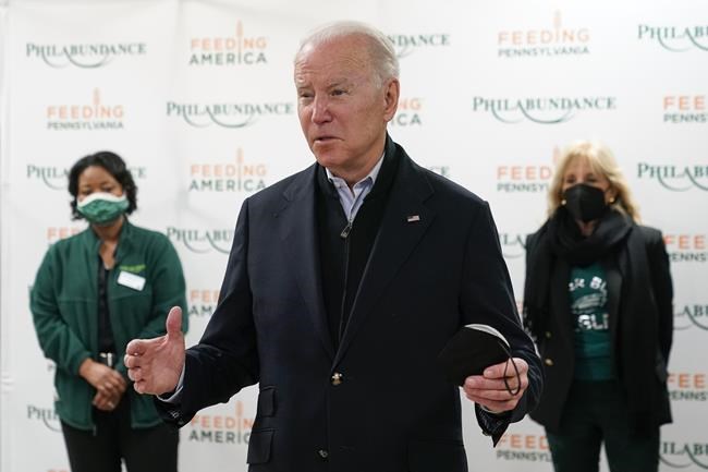 President Joe Biden speaks with members of the press about the Texas synagogue hostage incident before volunteering with first lady Jill Biden, back right, at hunger relief organization Philabundance, Sunday, Jan. 16, 2022, in Philadelphia. (AP Photo/Patrick Semansky)