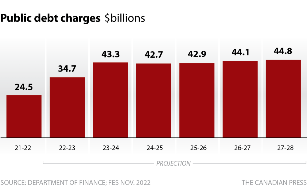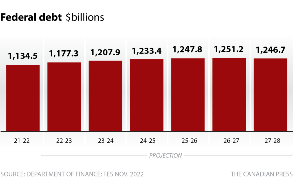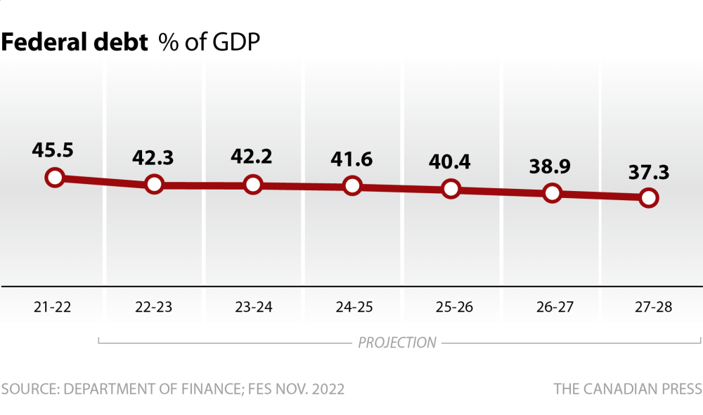 The fiscal update says the federal debt as a share of GDP is 42.3 per cent in fiscal 2022-23 and projected to steadily decline until reaching 37.3 per cent in fiscal 2027-28.