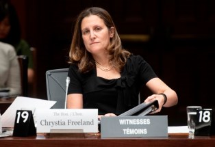 Deputy Prime Minister and Minister of Intergovernmental Affairs Chrystia Freeland waits to appear before the House of Commons Standing Committee on International Trade Tuesday February 18, 2020 in Ottawa. Freeland says she wants to make Canada's trade negotiations more "transparent," by agreeing to proposals from the New Democrats to provide more details of future deals. THE CANADIAN PRESS/Adrian Wyld