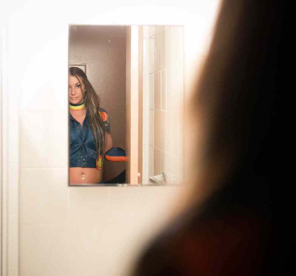 Aurora checks herself out in the mirror in the Chalet Hotel room before going on stage for the Miss Nude Winnipeg Contest at Teasers.