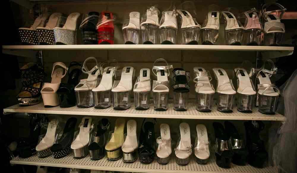 Melissa Tait / Winnipeg Free Press A shelf of platform shoes at Sexy Wear Exxxtreme inside the Chalet Hotel. Maria Lillies sews outfits for a large majority of exotic dancers in Manitoba out of the shop.