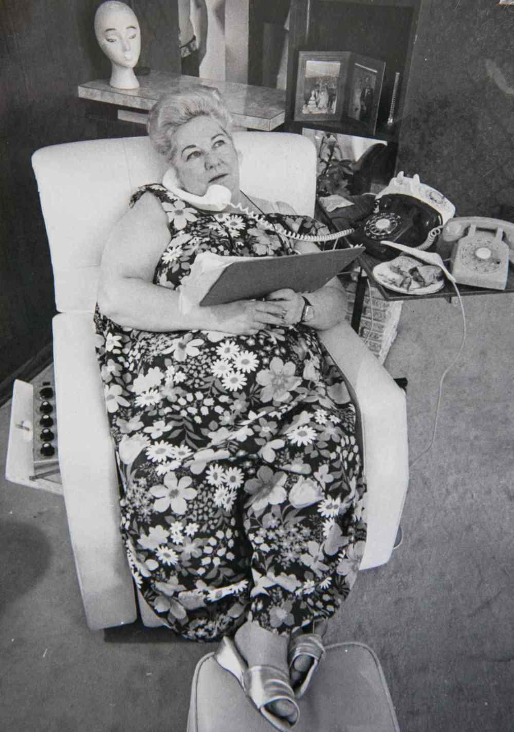 Gladys Balsillie at work on the phones some time in the 1970s, presumably booking dancers around Winnipeg.