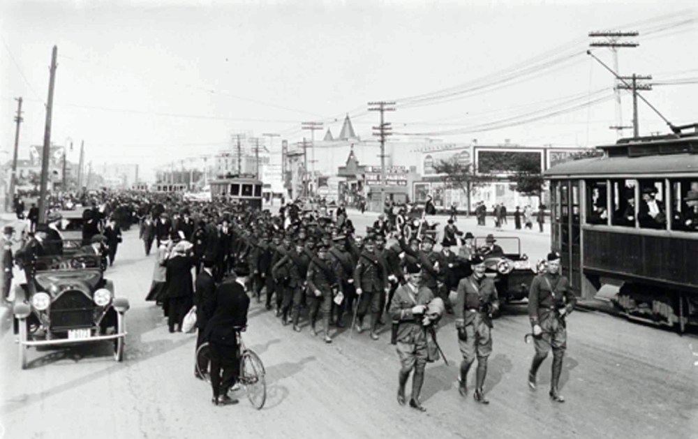 The first of many Great War military parades took to the Winnipeg streets almost as soon as war was declared. The members of the 90th Winnipeg Rifles militia regiment had been summoned to the drill hall at the corner of Broadway and Osborne. The Winnipeg Rifles was the oldest militia unit in Winnipeg, formed in 1885 at the time of the Métis resistance in Saskatchewan. A Métis fighter, referring to their black uniforms, had named them the Little Black Devils. They crossed to the university grounds on the north side of Broadway, formed ranks and marched up Kennedy Street to Portage Avenue and then on to city hall. Their band played the regimental march, Old Solomon Levi and Soldiers of the King, and the crowds cheered all along the way, many rushing into the street to march beside the militiamen.