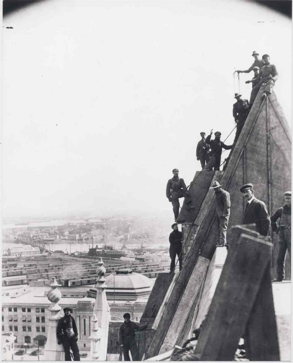 Workers sheathe with copper the roof of the Fort Garry Hotel in 1914. The Prairie economy had stalled and the city was flooded with unemployed men.
