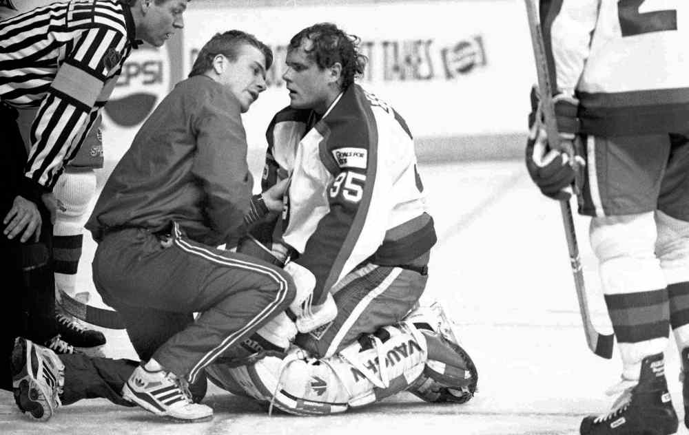 “It knocked me for a loop,” recalls Essensa, now the goalie coach of the Boston Bruins. “I was goofy for a little bit. I remember (the trainers) coming out and asking me questions, and one of the ones that I didn’t get was, ‘What’s the score?’”