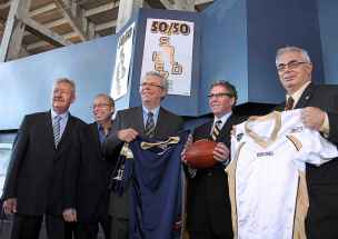WAYNE GLOWACKI / WINNIPEG FREE PRESS FILES Under the grandstand in Canad Inns Stadium Wednesday, from left Ken Hildahl, Chair, Board of Directors of the Winnipeg Football Club, Mayor Sam Katz, Premier Greg Selinger, David Asper, Executive Chairman of Creswin Properties Inc. and David Barnard, pres. of the University of Manitoba pose for pictures after the announcement of a plan to accelerate the construction of Investors Group Field.