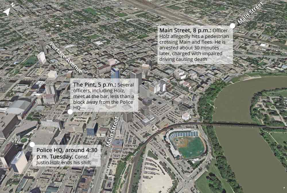 Severight, 23, died after being hit by a car as he was crossing Main Street at Sutherland Avenue near the Sutherland Hotel around 8 p.m. Oct. 10, 2017. The driver fled the scene, and Holz, a 34-year-old, eight-year member of the Winnipeg Police Service, was arrested shortly afterward. Before the crash, the Free Press previously reported, Holz was with up to six colleagues drinking at The Pint on Garry Street after they all got off duty around 4:30 p.m. that day.