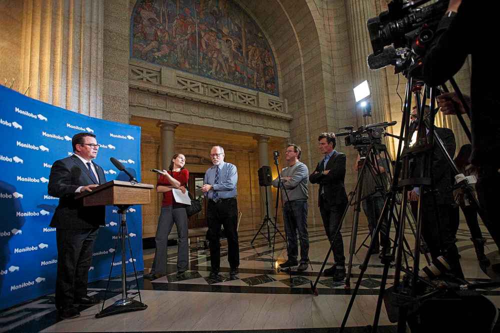 MIKE DEAL / WINNIPEG FREE PRESS Municipal Relations Minister Jeff Wharton speaks to reporters on Wednesday.