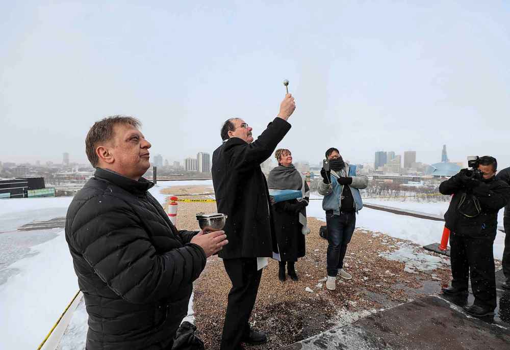 RUTH BONNEVILLE / WINNIPEG FREE PRESS Archbishop Albert LeGatt blessed the new LED rooftop cross at St. Boniface Hospital on Monday morning. The hospital's president and CEO Martine Bouchard was in attendance.