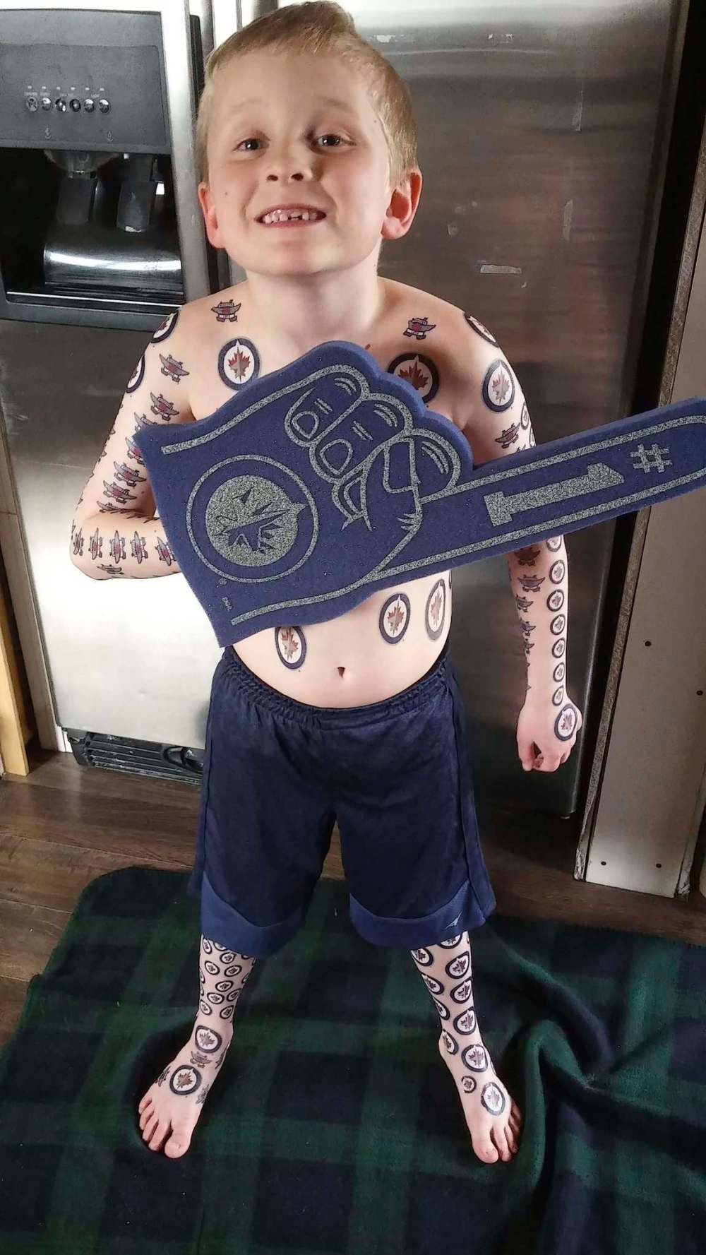 Dyson Labossiere doesn’t just wear his love for the Winnipeg Jets on his sleeve. He’s worn it on his arms and legs, chest and back.
