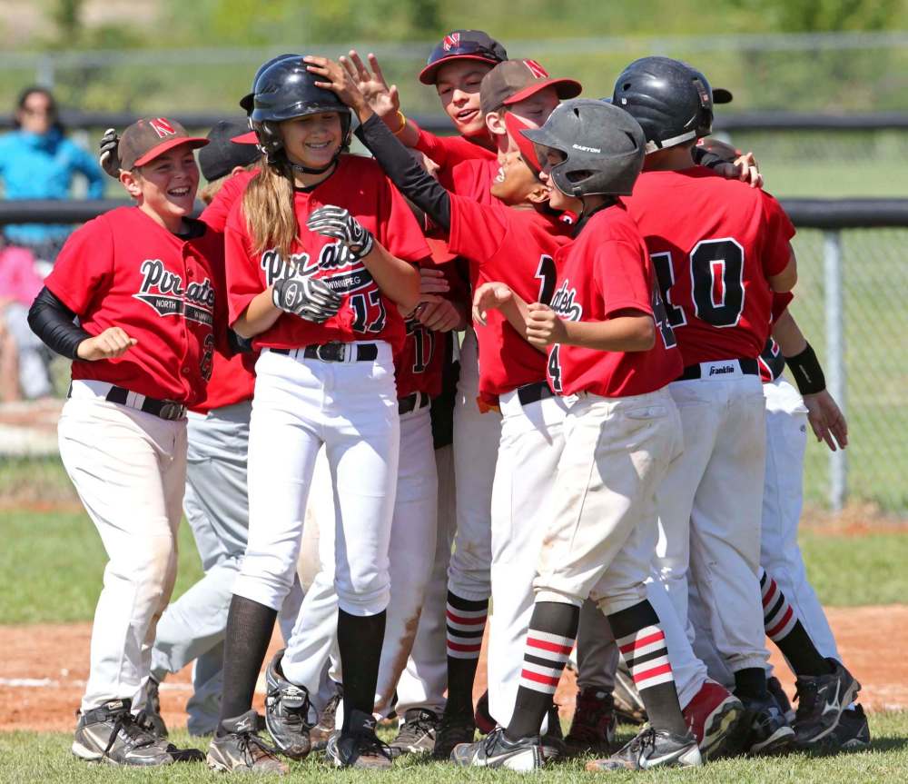 Brittney Langlais, second from left, is swarmed by the North Winnipeg Pirates after her game-winning RBI during the Peewee AAA Provincial Championship in 2013. TIM SMITH / BRANDON SUN FILES