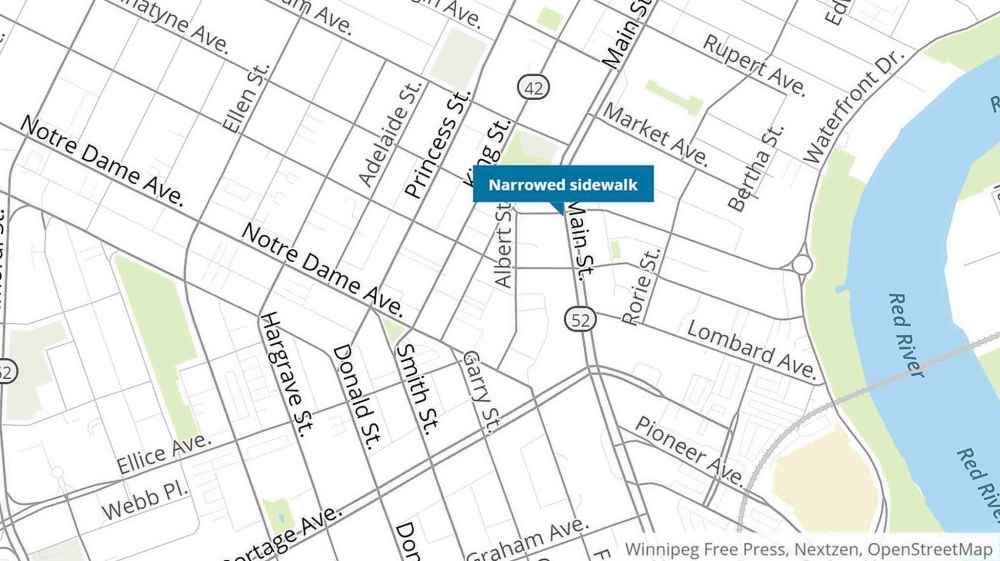 Recently, however, we took a small but important step backward, when a segment of the sidewalk on Main Street at Bannatyne Avenue was reduced by more than half to add a drop-off lane to a street that is already eight lanes wide. The resulting sidewalk, about two metres wide, is narrower than the city’s own standards for accessibility, even before factoring in snow accumulation and space for vehicle-door swings.