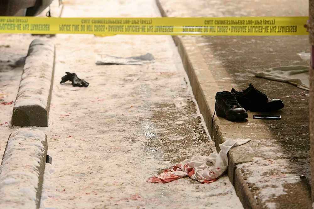 Police evidence tags littered the ground, bullet holes were chipped into the wall, blood was smeared across concrete.