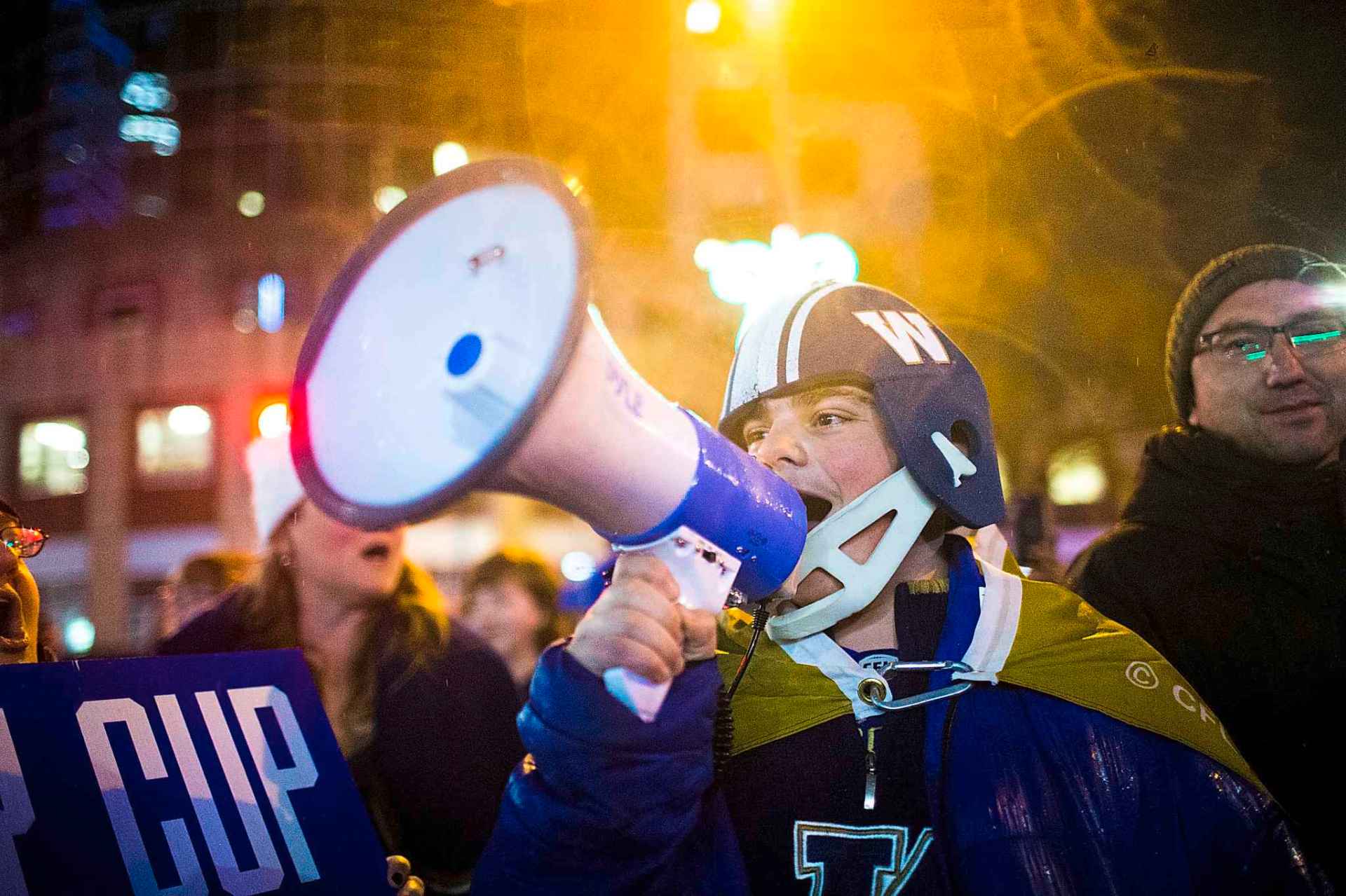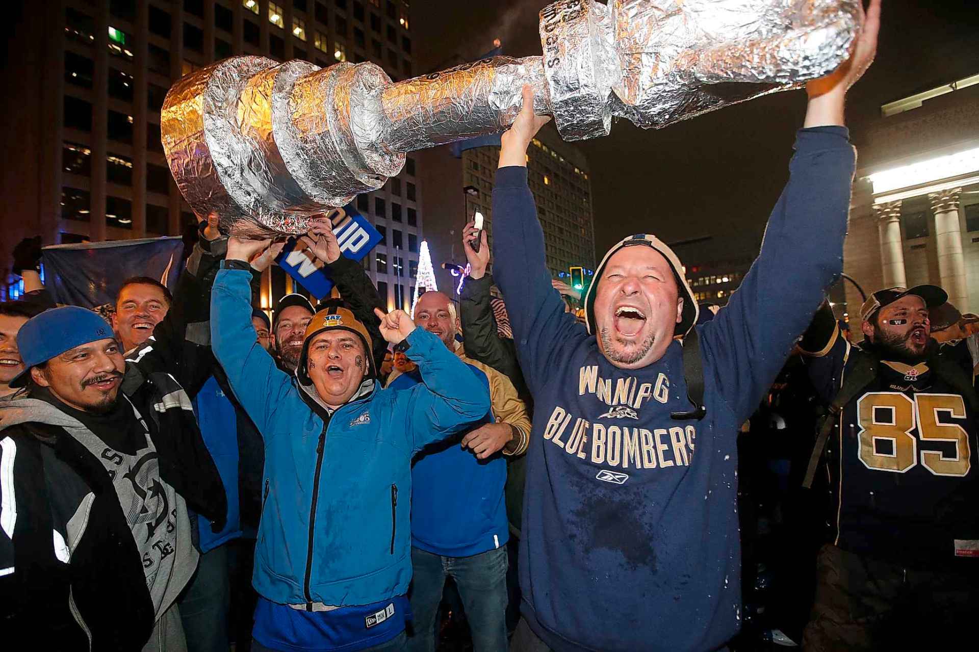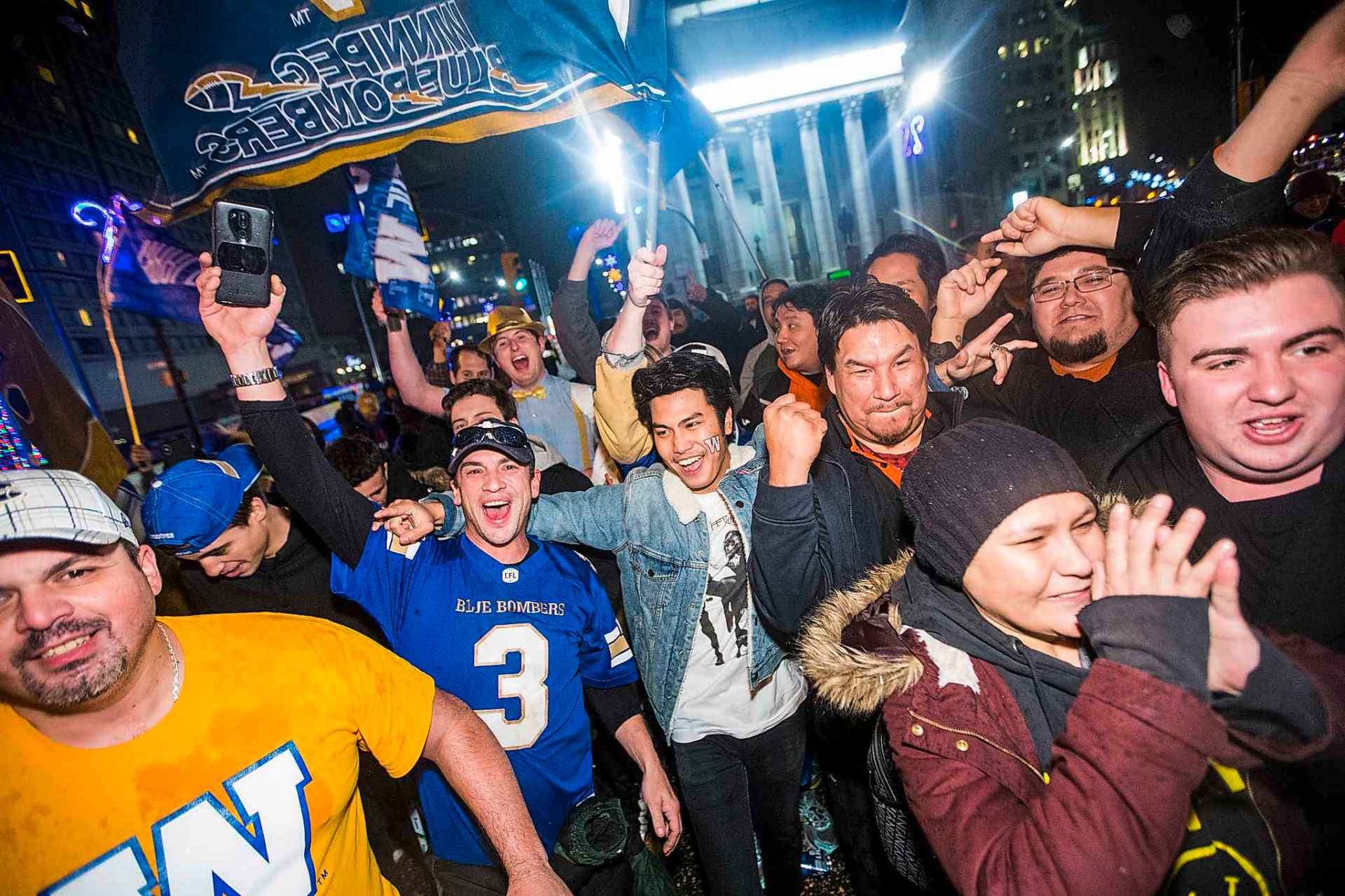 Popping champagne and blasting Queen’s We Are The Champions over a speaker, Winnipeg Blue Bombers fans gathered on Portage and Main as their 29-year Grey Cup drought ended.