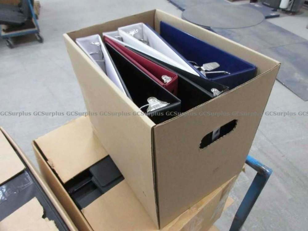 These three-ring binders come in “assortes (sic) sizes and colours,” packed in cardboard boxes, one of which is labelled “2005.”
