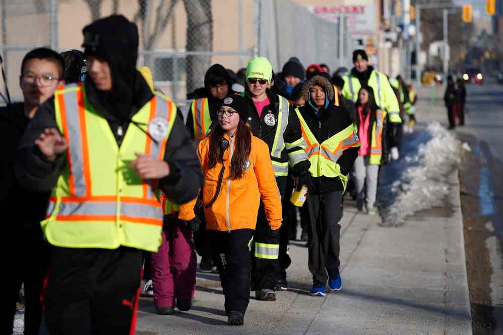 Dozens of students donned neon vests to patrol the West End streets surrounding General Wolfe School after the afternoon bell rang, marking the first time the Indigenous-led community watch group has partnered with schools.