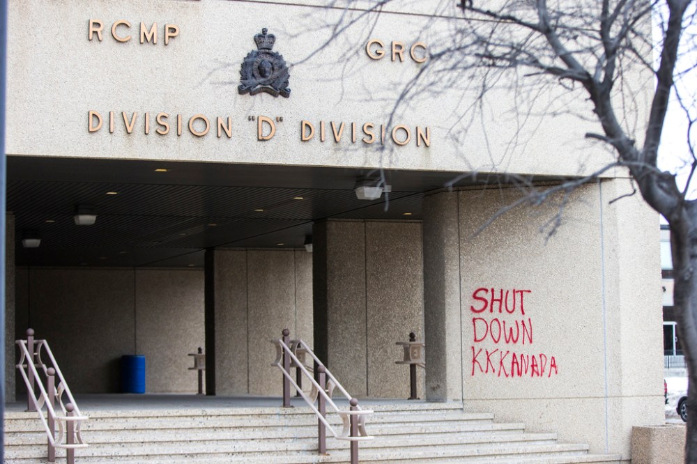 Messages written on the RCMP building included, “Shut down Canada,” “Land back,” and “No more.” The statements appear to echo support of the Wet’suwet’en hereditary chiefs and their opposition to a pipeline project in northern British Columbia.