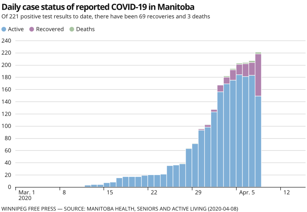 On Wednesday, Roussin announced just four new COVID-19 cases, bringing the total in Manitoba to 221. He also revealed that a total of 69 persons are now listed as recovered from the coronavirus, an increase of 48 from the previous day.