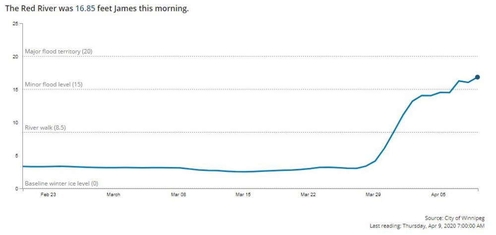 Once the floodway is put into operations this leaves the expected peak water levels in Winnipeg at the James Avenue gauge arriving between April 13 and 17, reaching a level between 19 and 19.5 feet.