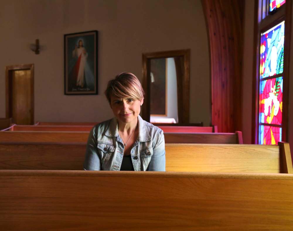 As light streamed into the room through the stained-glass window, Nemcek stood with his book of prayers next to the painting.