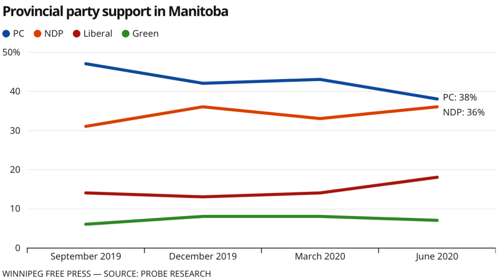 In seat-rich Winnipeg, the poll shows huge support for the NDP amid a sharp decline in popularity for Premier Brian Pallister’s government. Provincewide, the two parties have a statistical tie: the Tories have 38 per cent, the NDP has 36 per cent, the Liberals 18 per cent and the Green party has seven per cent.