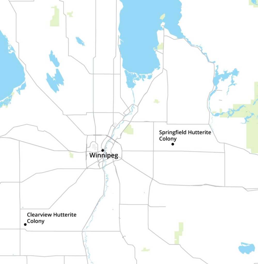 The Springfield Hutterite Colony, located 50 kilometres east of Winnipeg off Highway 15, has one family in isolation after the father tested positive for COVID-19 upon returning from a business trip to Alberta. The Clearview Hutterite Colony, located 50 kilometres west of Winnipeg near Elm Creek, has one woman in isolation after she tested positive.