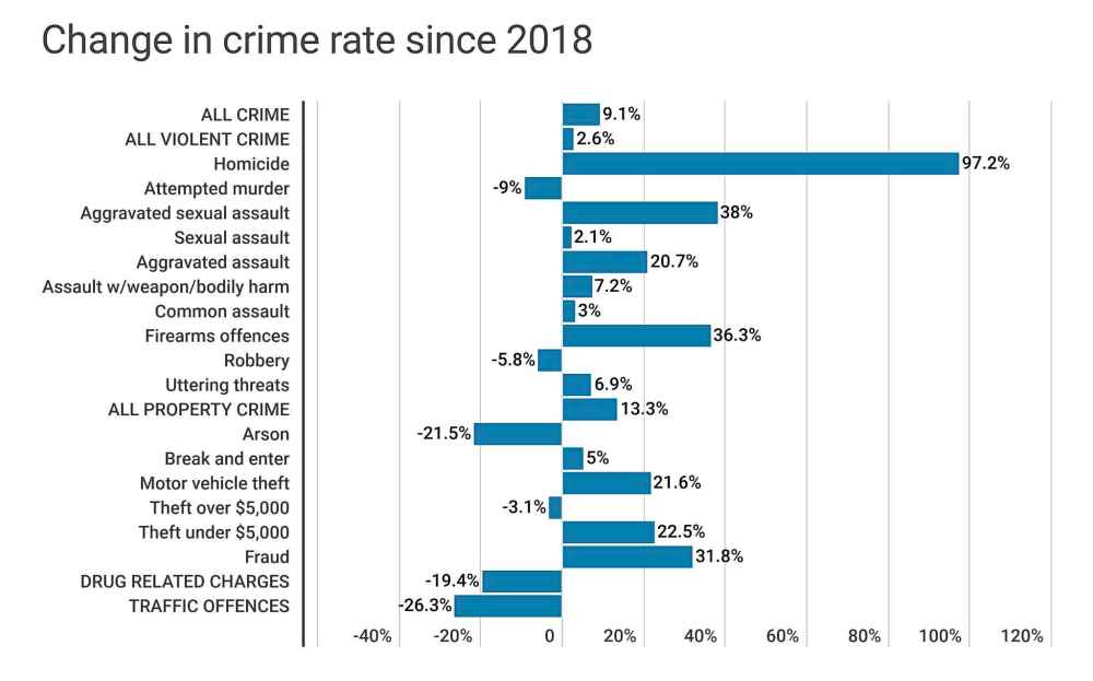 Violent crime on the whole saw a four per cent increase in 2019 over the previous year, and a 17 per cent increase over the five-year average. Property crimes rose 14 per cent (year-over-year) and 47 per cent (over the five-year average).