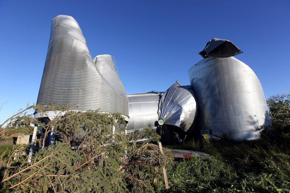 Grain silos were crumpled up like they were made of paper, with several of them being either toppled over or torn apart because of the wind.