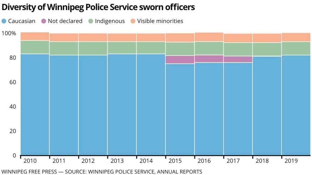 And while the Winnipeg Police Service shares information on sworn officers who identify themselves as women, Indigenous people or members of visible minority groups, it appears there’s been little change to the force’s makeup over the past 10 years.