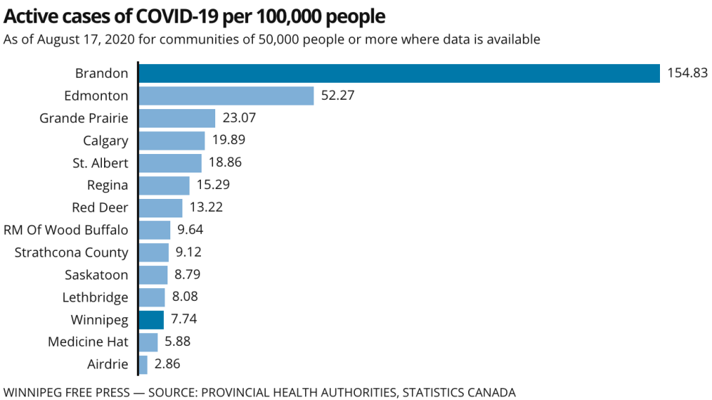 The situation was recently highlighted in Brandon, where a cluster of cases that included some workers at the Maple Leaf Foods Inc. plant made national headlines. While case counts in the west Manitoba city are slowing, Brandon has a higher per capita rate of COVID-19 than hotspots in Alberta, and nearly 20 times as many cases per 100,000 people as Winnipeg.