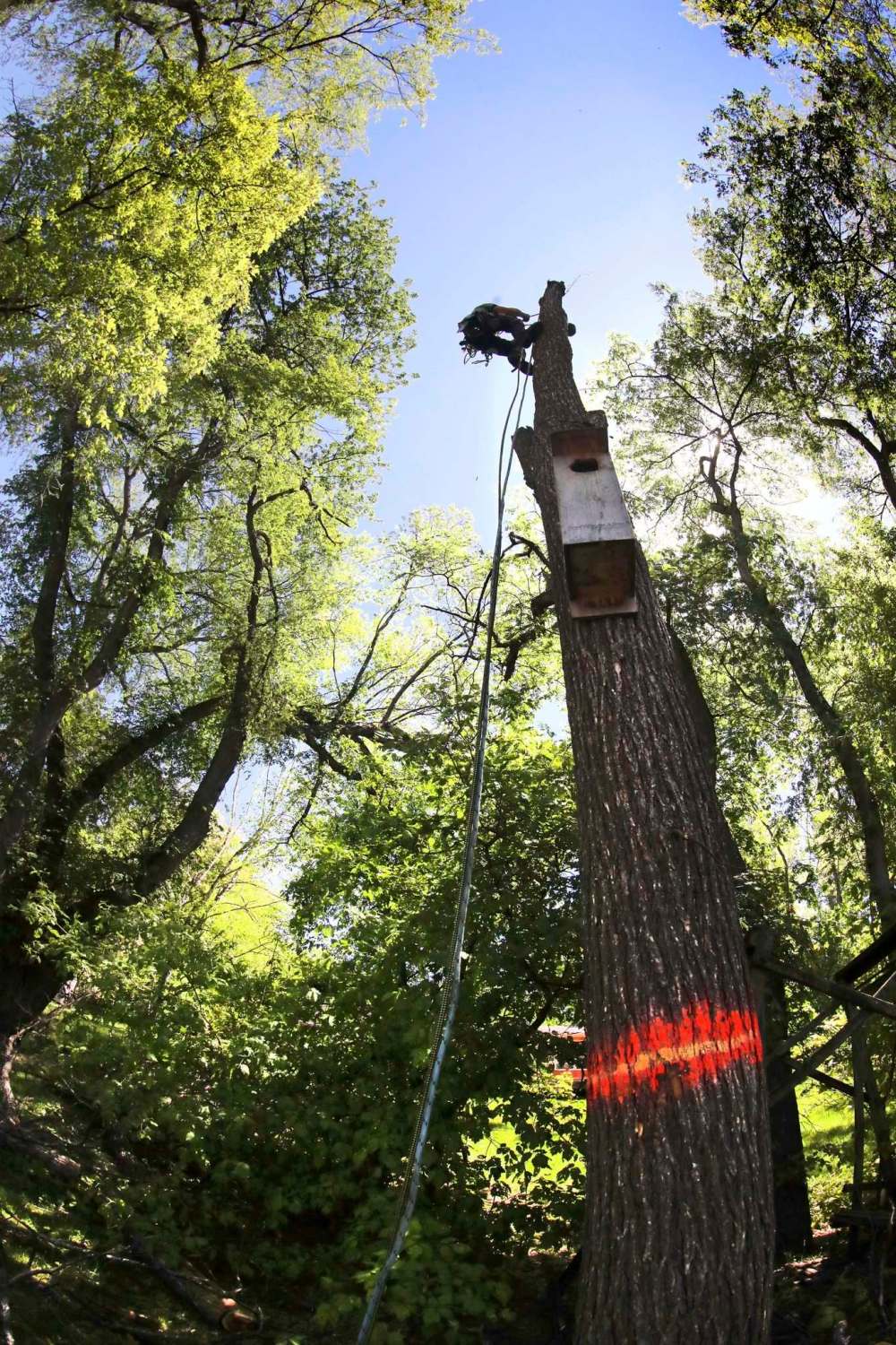 A City of Winnipeg arborist takes down a diseased elm tree.