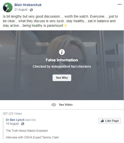 Hrabarchuk also posted links to several YouTube videos that promote conspiracy theories, including some that claim masks do not help reduce the transmission of viruses. One of those videos has since been fact-checked by Facebook and labelled “false information.”
