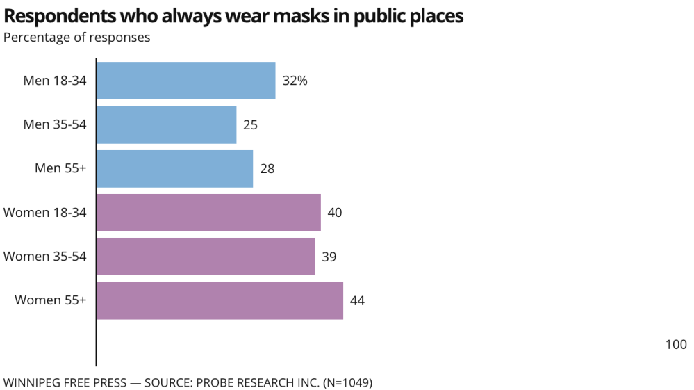 The survey of 1,049 Manitobans, which was conducted over 10 days in August, found women, Winnipeg residents and university graduates were more likely to support mandatory masks than were men, people who live outside the capital, and those with lower levels of education.