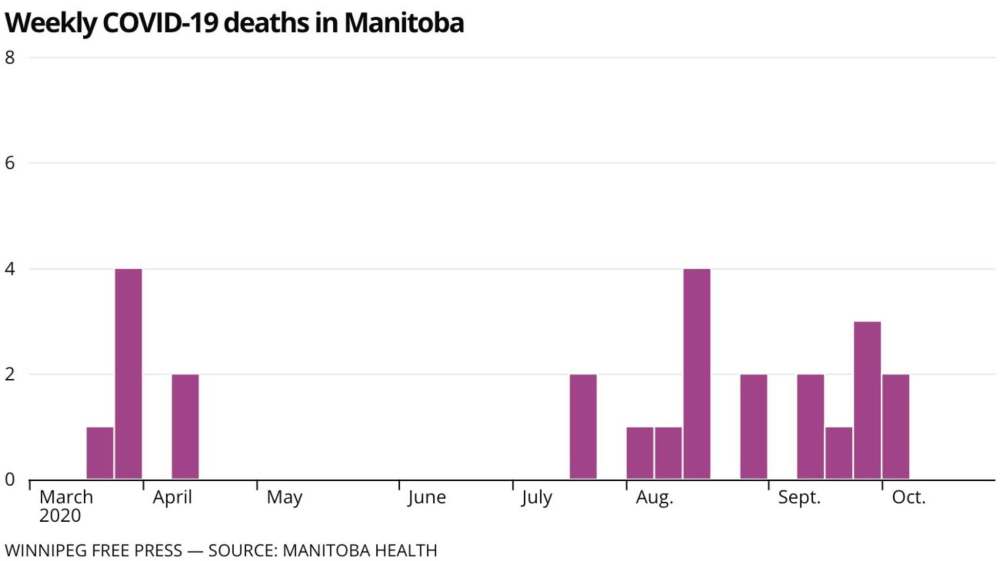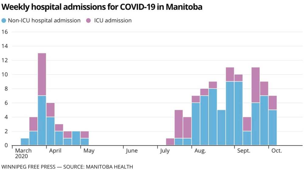 On the same day, the number of people hospitalized with COVID-19 doubled to 28, from 14 on Sept. 29. Half of those hospitalized in the province are in Winnipeg.