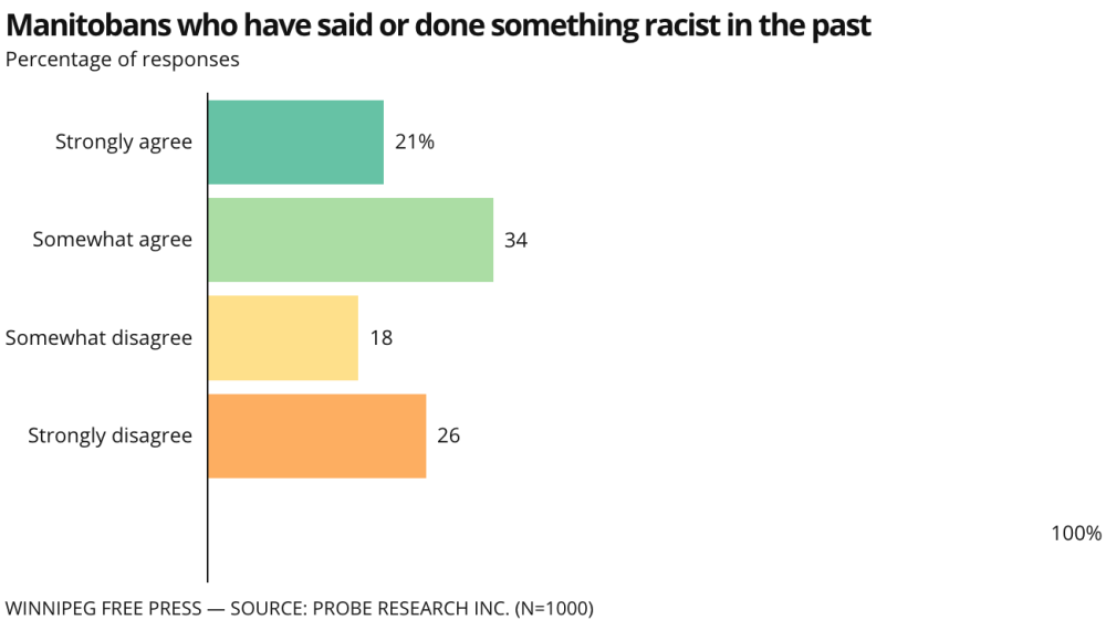 The question on past racist behaviour was posed to Manitobans as part of a survey conducted Sept. 8-17 by Probe Research, in partnership with the Winnipeg Free Press.
