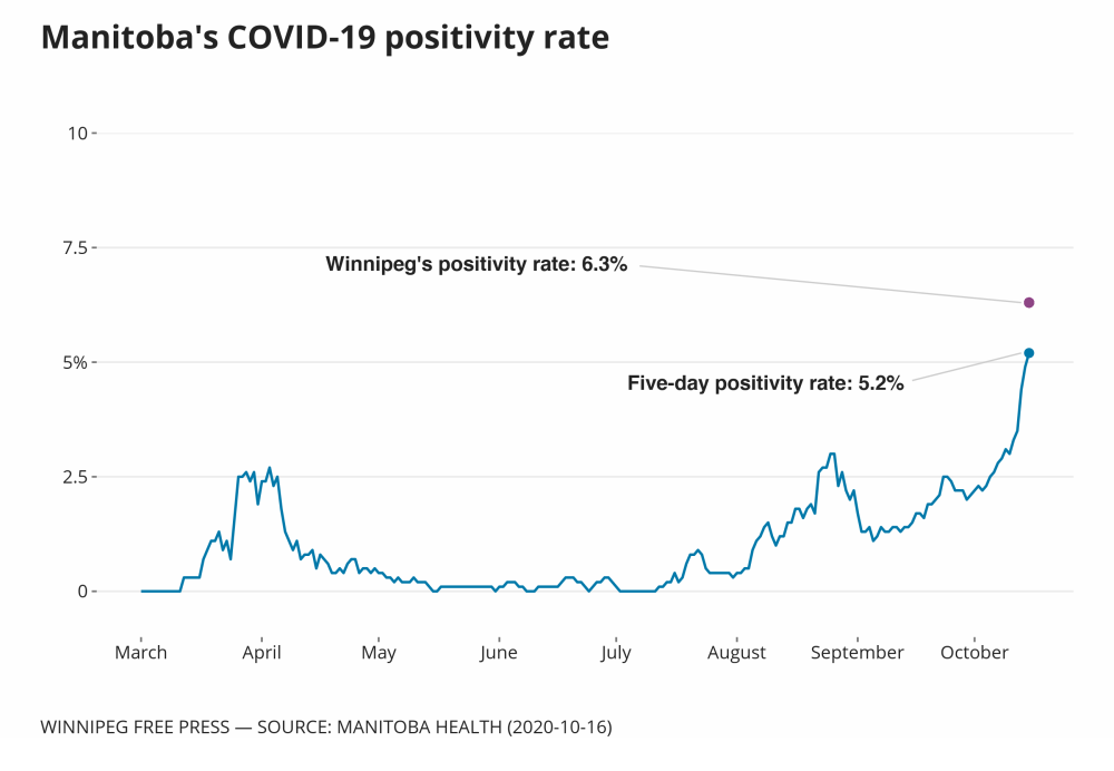 Dr. Brent Roussin, chief provincial public health officer, started his Friday news conference by noting Manitoba’s test-positivity rate was 5.2 per cent — in Winnipeg, it’s 6.3 per cent.