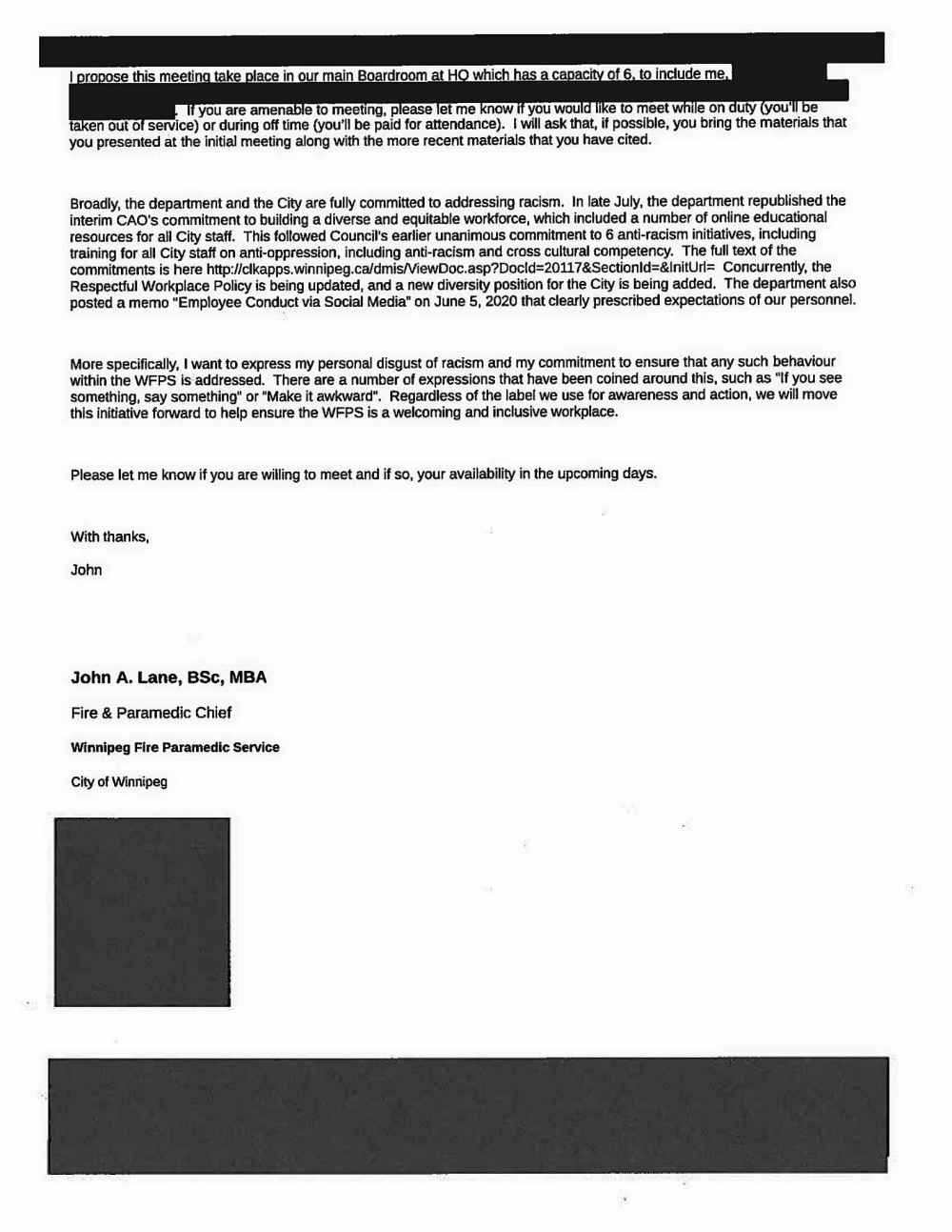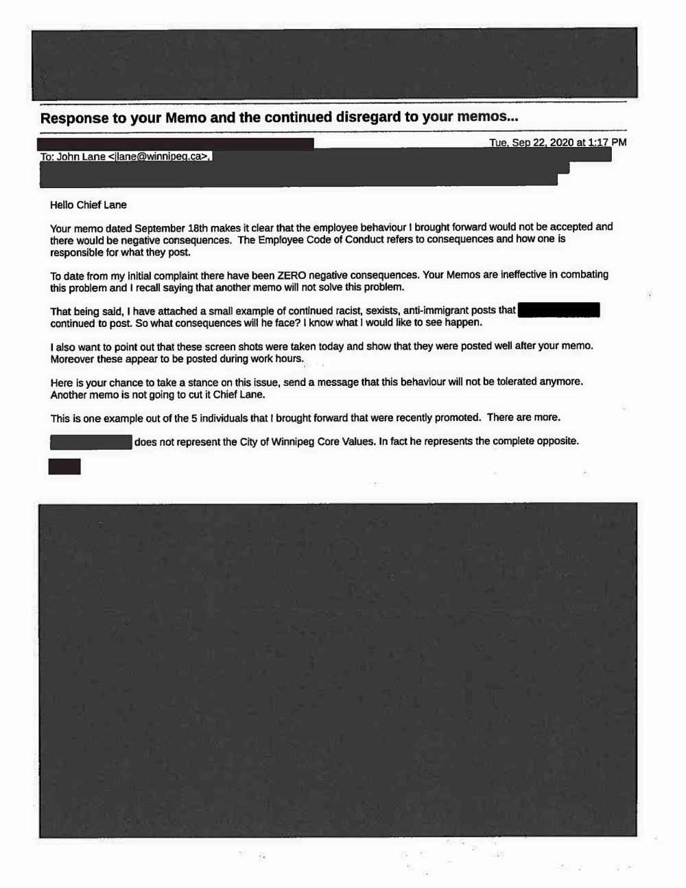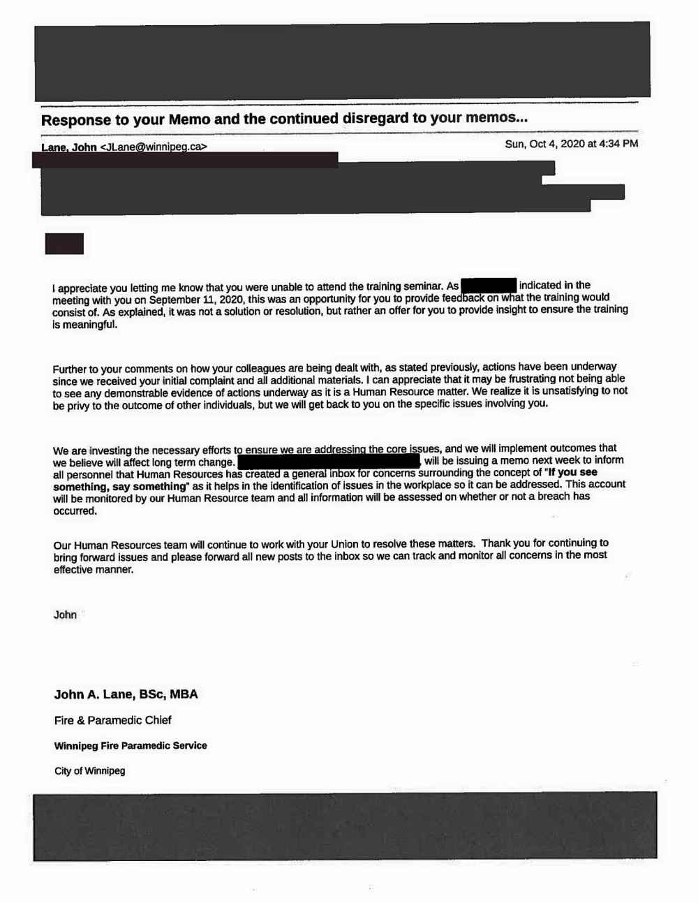 The leaked internal emails are between a department whistleblower and Lane. They begin with an Aug. 31 email from the whistleblower, who complains department brass has failed to address racist behaviour by WFPS members.