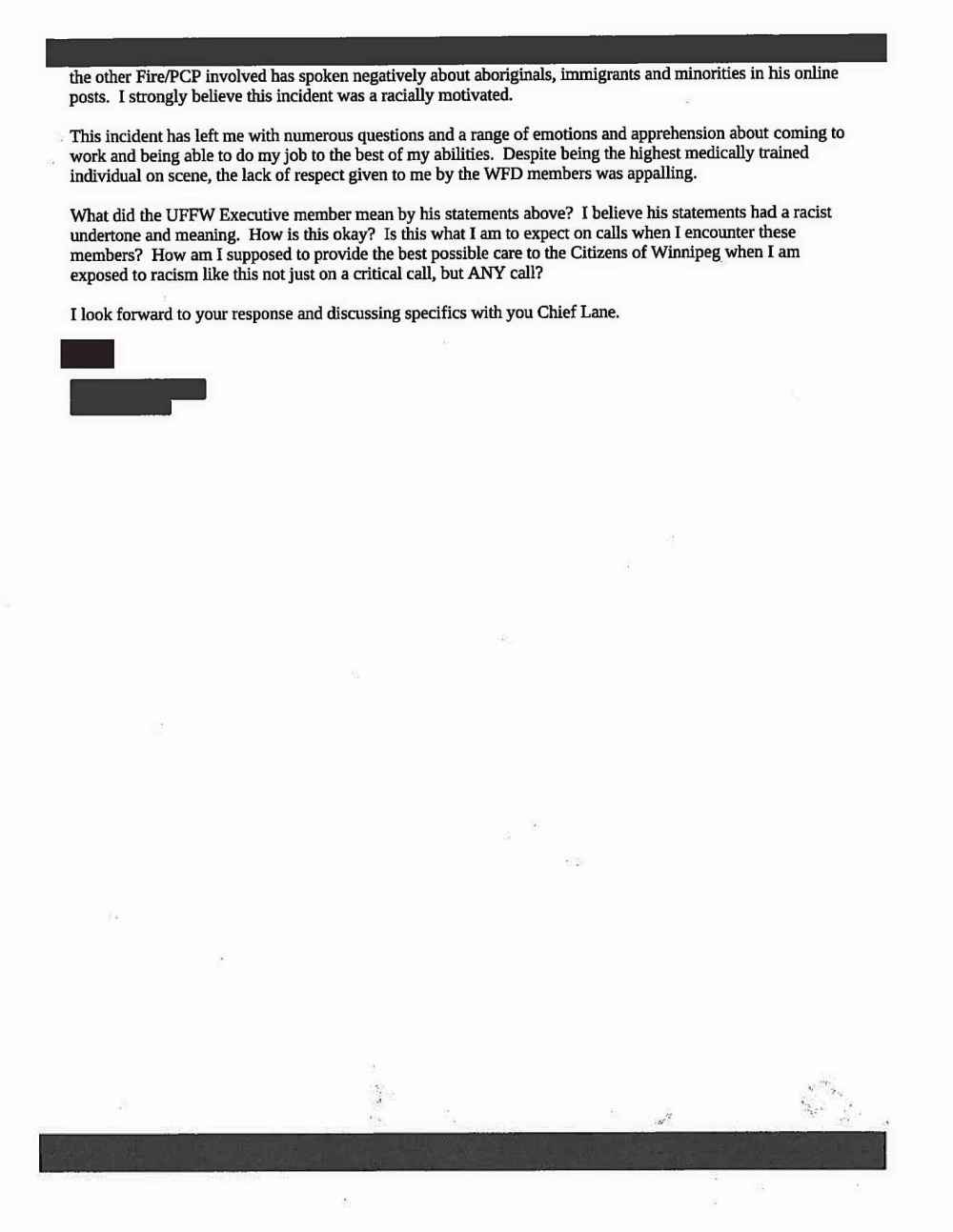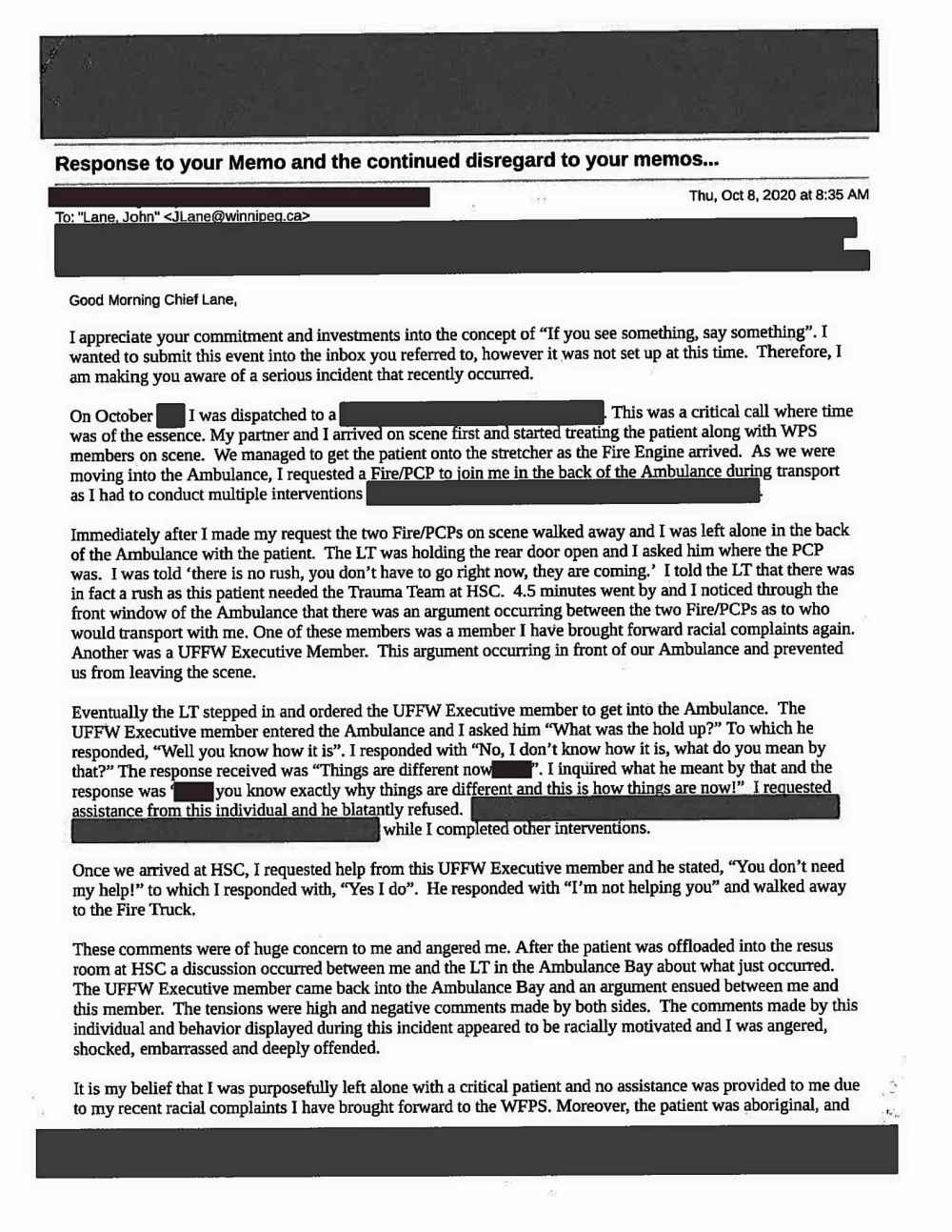 “It is my belief that I was purposefully left alone with a critical patient and no assistance was provided to me due to (the) recent racial complaints I have brought forward to the WFPS.” – Whistleblower email