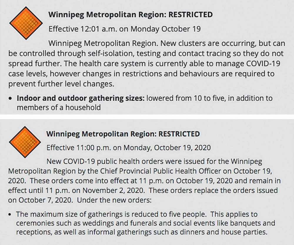 “However, the intent was always that those in the Winnipeg metropolitan region would reduce gathering sizes to five effective Monday morning in alignment with the restrictions as announced on Friday of last week.“