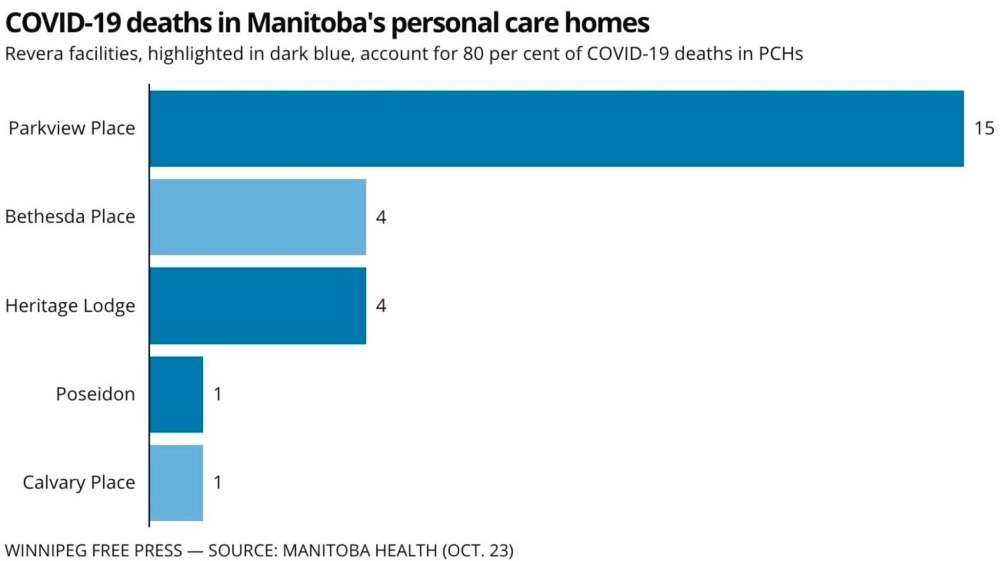 To date, there have been 25 deaths in Manitoba care homes and more than 120 cases involving residents. Fifteen of those deaths involved residents from the Revera-owned downtown Parkview Place Long Term Care Home, continuing a trend across the country of deadlier outbreaks at privately owned facilities.