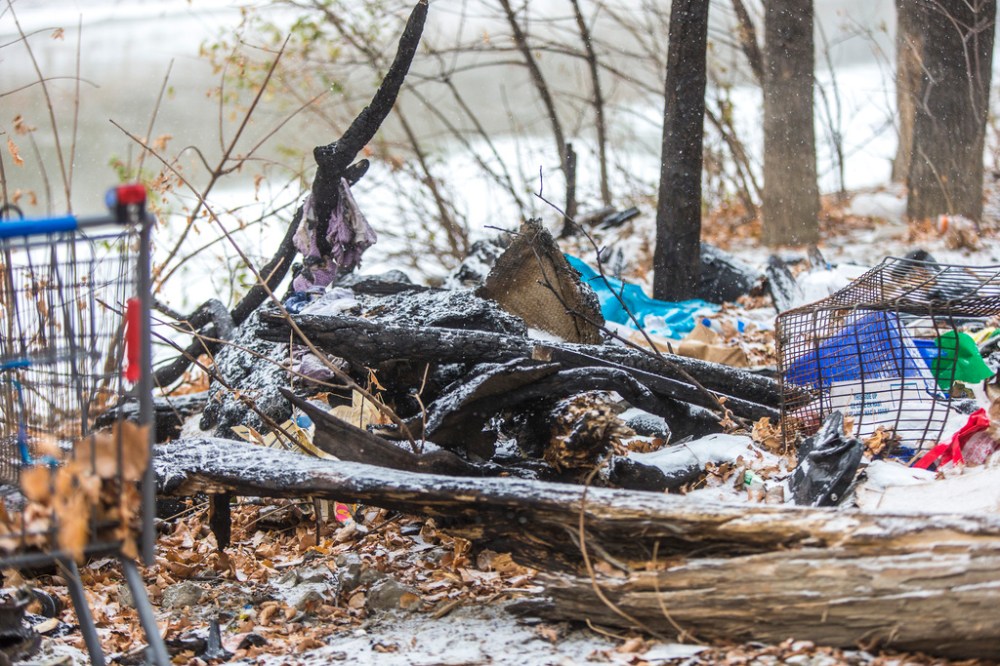 At the site, burned and torn tarps of all shapes and sizes provide meagre cover when they weren’t in tatters. Scorched propane tanks are strewn about. Piles of garbage, from bags of clothing to wooden pallets to shopping carts to bikes to smashed-up power tools, are strewn in the area.
